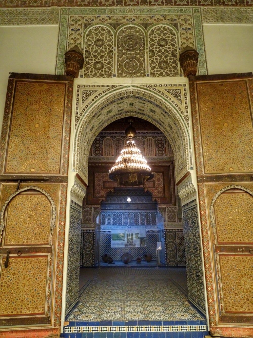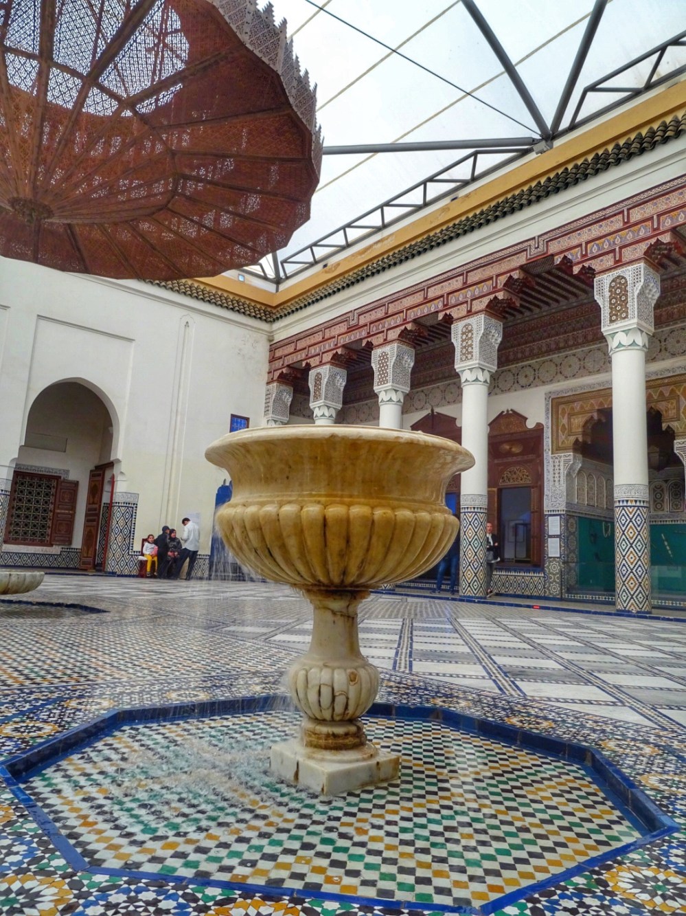 La camera non è ancora pronta, ma l’attesa è deliziata da un buonissimo the alla menta accompagnato da biscottini tipici! Lasciati i bagagli in stanza ci dirigiamo verso il Museo di Marrakesh (9-18.30 4,60€) La struttura non è molto grande e la parte principale è il grande cortile con le due fontane e l’enorme lampadario. Peccato sia coperto da una cupola che non lascia passare il sole e quindi le foto diciamo che non vengono con una luce bellissima!All’interno troverete le sale di un hammam tradizionale e alcune stanze con mostre temporanee.