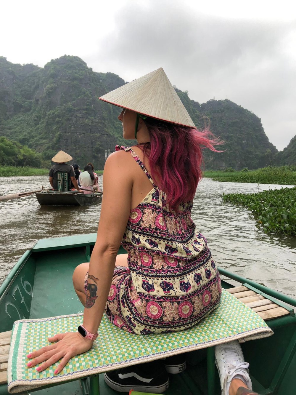 Prendiamo un barca a remi per percorrere il fiume Ngo Dong passando attraverso tre grotte: Hang Ca, Hang Hai, Hang Ba. È usanza dei barcaioli remare usando i piedi.