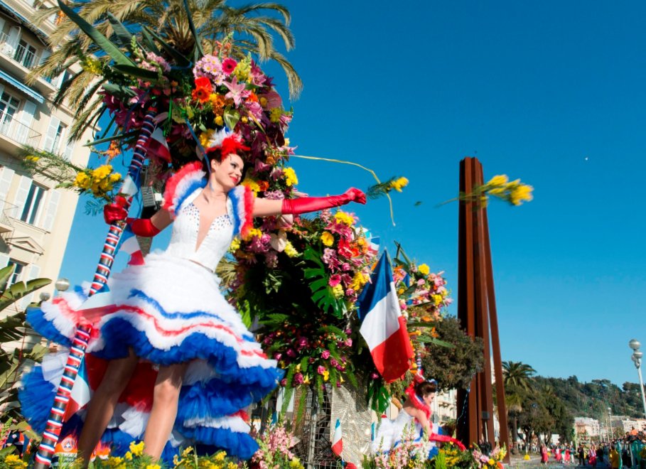 Su ognuno di essi modelle in maschera lanciano migliaia di fiori sulle tribune posizionate lungo tutta la passeggiata. Per poter aggiudicarsi un posto in tribuna bisogna acquistare un biglietto dal costo di 26€, ma cè anche la possibilitá del posto in piedi a 12€.